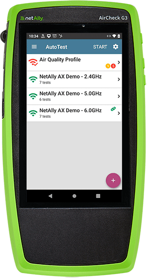 AutoTest is the most comprehensive NetAlly testing app on the AirCheck G3. It allows you to quickly run a variety of test types and save their configurations and network credentials for access whenever you need them. The app is fully customizable with test “profiles” for W-iFi network connections, wireless air quality, and individual “test targets” that can run with any profile.