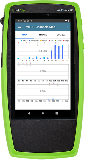 Trying to find the source of Wi-Fi interference on a wireless network is hit or miss with the wrong tools. Using the optional NXT-2000 Portable Spectrum Analyzer, AirCheck G3 offers a view of RF interference in the 2.4, 5, and 6 GHz bands and its impact on the wireless network’s overall performance. Key graphs and charts include: