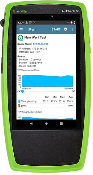 The AirCheck G3 uses iPerf v3 to run performance tests against the NetAlly Test Accessory or any iPerf v3 server. Performance can be measured using TCP or UDP throughput in the upstream or downstream direction.