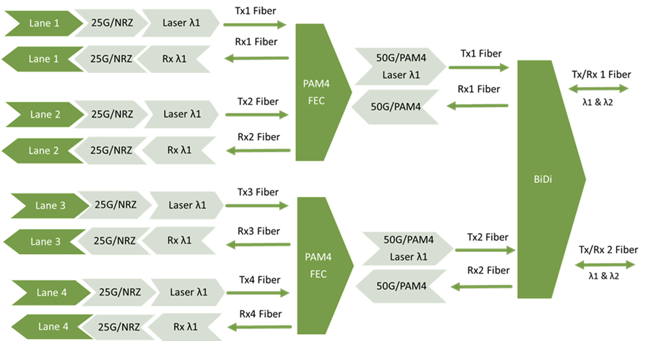 - Reduced operational costs: BiDi allows for a straightforward 25G/40G/50G/100G upgrade path from 10G and 40G BiDi without changing the physical fiber layout.