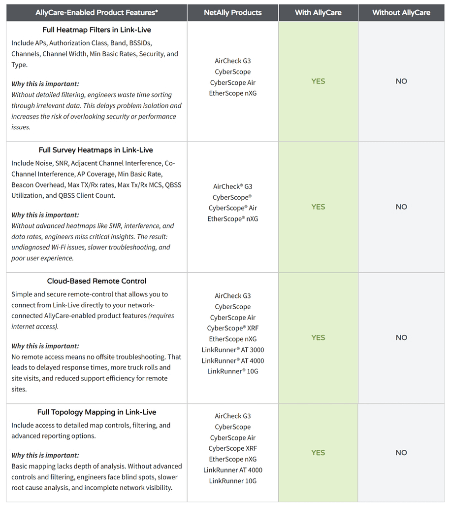 - AllyCare membership may not be available in all countries. Please confirm with your NetAlly representative before purchasing.