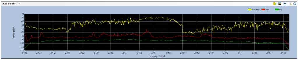 The x-axis shows frequency range and the y-axis shows the detected power readings in dBm. This graph can phase four different types of color-coded spectrum data.