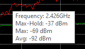 Mousing over any frequency will display a Tool Tip that contains Max-Hold, Max, and Average information for that frequency.
