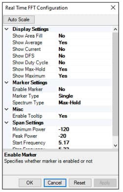 - Peak Power: Enables changing the maximum power level on the y-axis. By default, it is set to -120 dBm, but it can be set to any value less than 0 dBm.