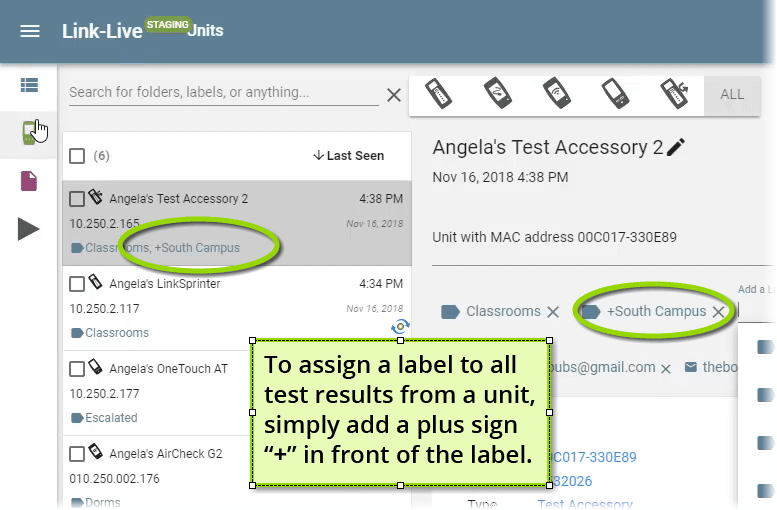 Normally, labels attached to a Unit are only associated with the unit and not test results. To attach a label to all test results from a specific unit, add a plus sign “+” in front of the unit’s label on the Units page, as shown below.