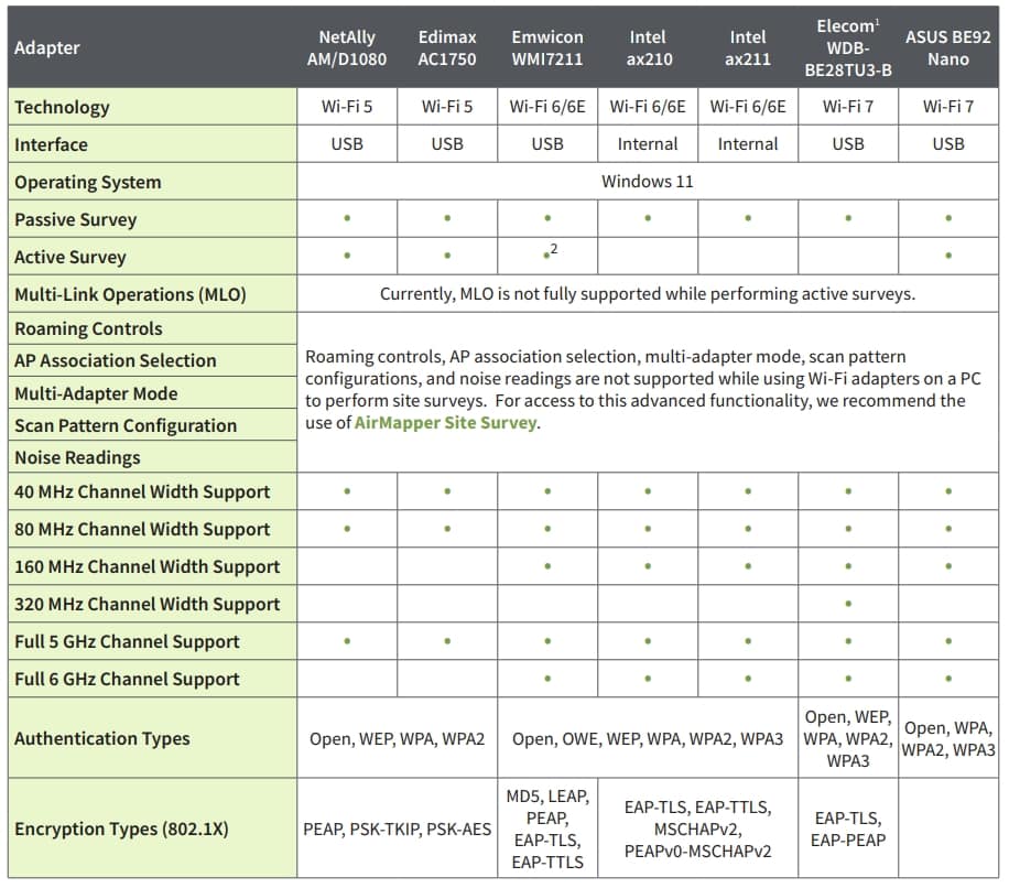 The recommended adapters on this list have been tested by NetAlly. Other Wi-Fi adapters, not shown above, can also be used with AirMagnet Survey PRO but have not been tested, may not support all functionality, and could provide inaccurate data. Authentication methods supported by various adapters could be limited by their own capabilities, Windows wireless zero configurations and various other reasons.