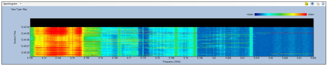 The Spectrogram graph provides another way to present the data as shown on the Real-Time FFT chart. It displays the changes in the spectrum over a period of time and identifies any shift in frequency use along with the duration of such shifts. The X-axis shows the frequency range covered by the selected radio band and the Y-axis shows, in real time, the number of sweeps the spectrum adapter scans the RF spectrum. It displays the historical performance of the spectrum over the last few minutes and can maintain, for a short while a record of events, that a user could potentially miss in other graphs. It is also useful for picking out patterns in the detected data transmissions and determining if a signal is background noise or an interference source