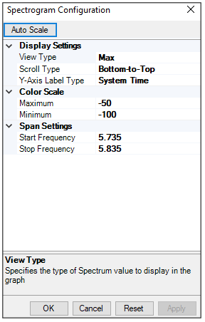 - View Type: allows the configuration of the type of data to be displayed on the Spectrogram