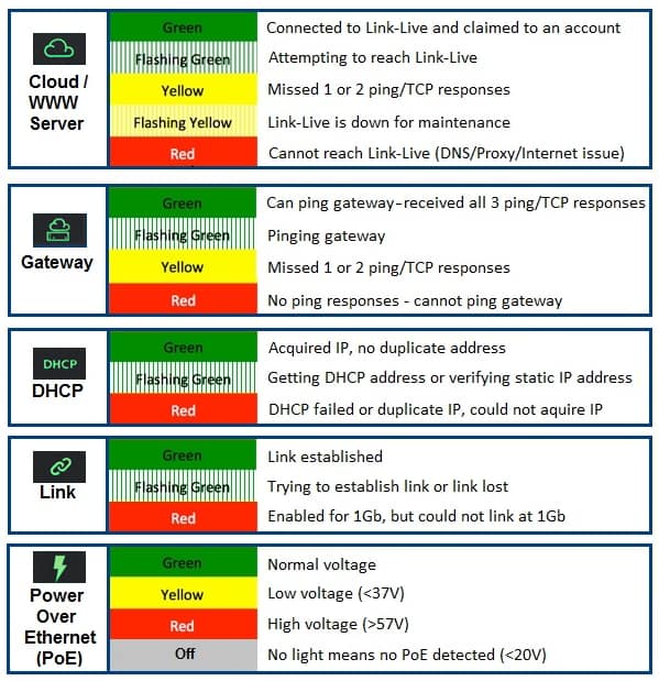 - LEDs flashing YELLOW/ORANGE in a sequence from the PoE symbol up to the Cloud symbol means the unit is updating its firmware.
