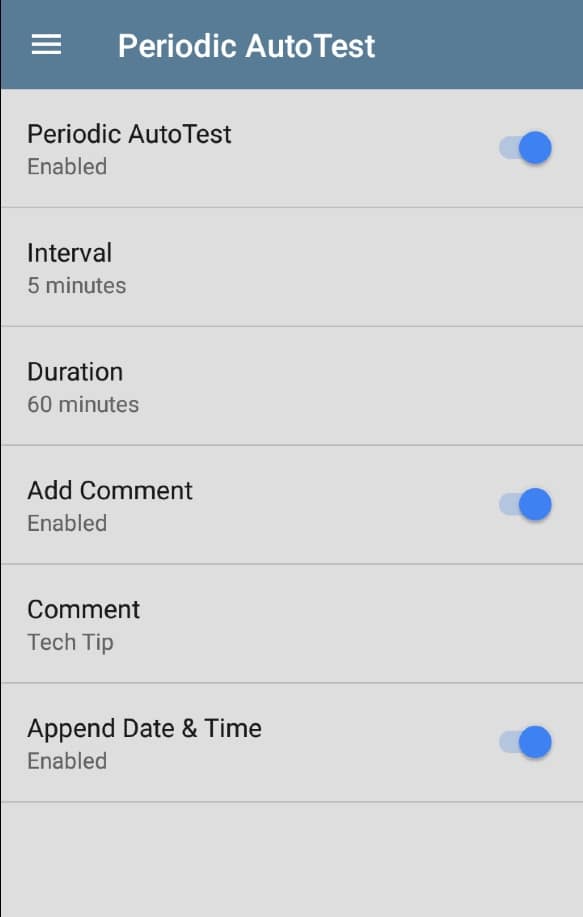 This test gives us a point-in-time view of the availability of each of the network resources referenced in the AutoTests. To troubleshoot intermittent problems, we need to run this AutoTest group on a regular interval, over a period of time. This is when the Periodic AutoTest comes in. The first step in enabling Periodic AutoTest is to tap on the settings icon at the top of the AutoTest group screen. From here, tap on Periodic AutoTest. Then tap the switch to enable Periodic AutoTests. This will display the configuration options
