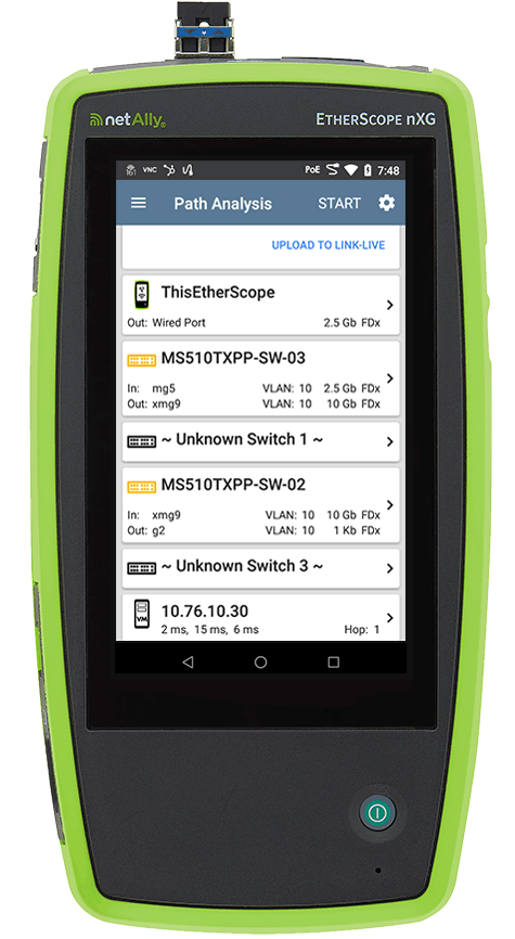 EtherScope nXG has the unique ability to break through the “visibility ceiling” between Wi-Fi and wired networks, showing who and what is on your network, where they are connected, and their path across your network.