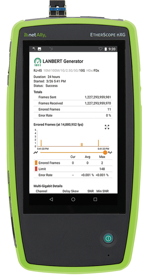The LANBERT media qualification app for EtherScope nXG provides a simple and fast method of assessing the quality of transmission and available bandwidth in your copper and fiber cable plant. When used with another LANBERT-compatible NetAlly tester (or a Loopback), LANBERT generates and measures the transmission of line rate Ethernet frames over your network cabling infrastructure, qualifying its ability to support 1G/10G on fiber and 100M/1G/2.5G/5G/10G on copper links.