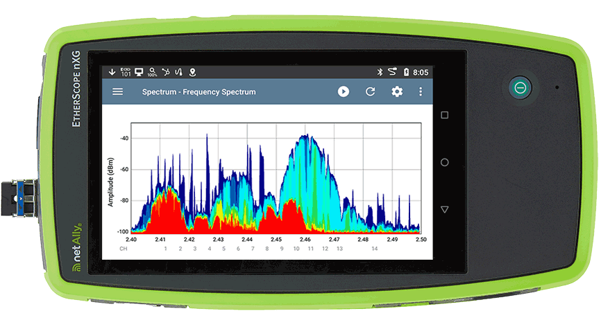 Trying to pinpoint the source of Wi-Fi interference on a wireless network is hit or miss with the wrong tools. Using the optional NXT-2000 Portable Spectrum Analyzer adapter, EtherScope nXG offers a view of RF interference in the 2.4, 5, and 6 GHz bands, plus visualizes its impact on the wireless network’s overall performance. Users of AirMagnet Spectrum XT (now discontinued) will find the combination of spectrum visibility in a handheld instrument with in-depth Wi-Fi analytics and ideal replacement.