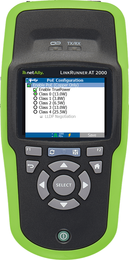 | Power over Ethernet (PoE) | Single-ended testing: User-defined testing to IEEE 802.3at class 0, 1, 2, 3, 4 without LLDP negation, or 4 with LLDP negotiation The following PSE PoE parameters are measured: Pairs used Received class PSE type Unloaded voltage(V) Loaded voltage (V) (LRAT-2000 with TruePower™) Unloaded power (W) (LRAT-1000) Loaded power (W) (LRAT-2000 with TruePower™) |