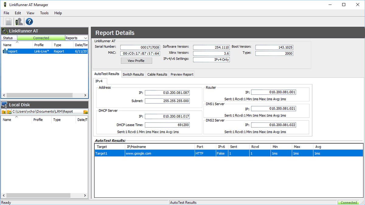 You also have the option to activate the Local Reporting Mode, which allows you to conveniently save AutoTest results directly on the tester itself. When the AutoTest results are saved locally, you can utilize the LinkRunner AT Manager Software, which is compatible with MS Windows, to efficiently manage and analyze test results, generate test reports, and manage your testers.