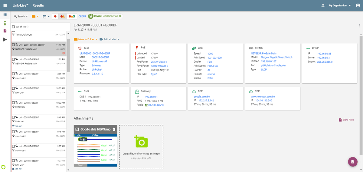 Runs a suite of functional tests, from PoE, link to network service availability, and support drill down for detail results. Result can be saved on unit or upload to the complimentary Link-Live Cloud Service.