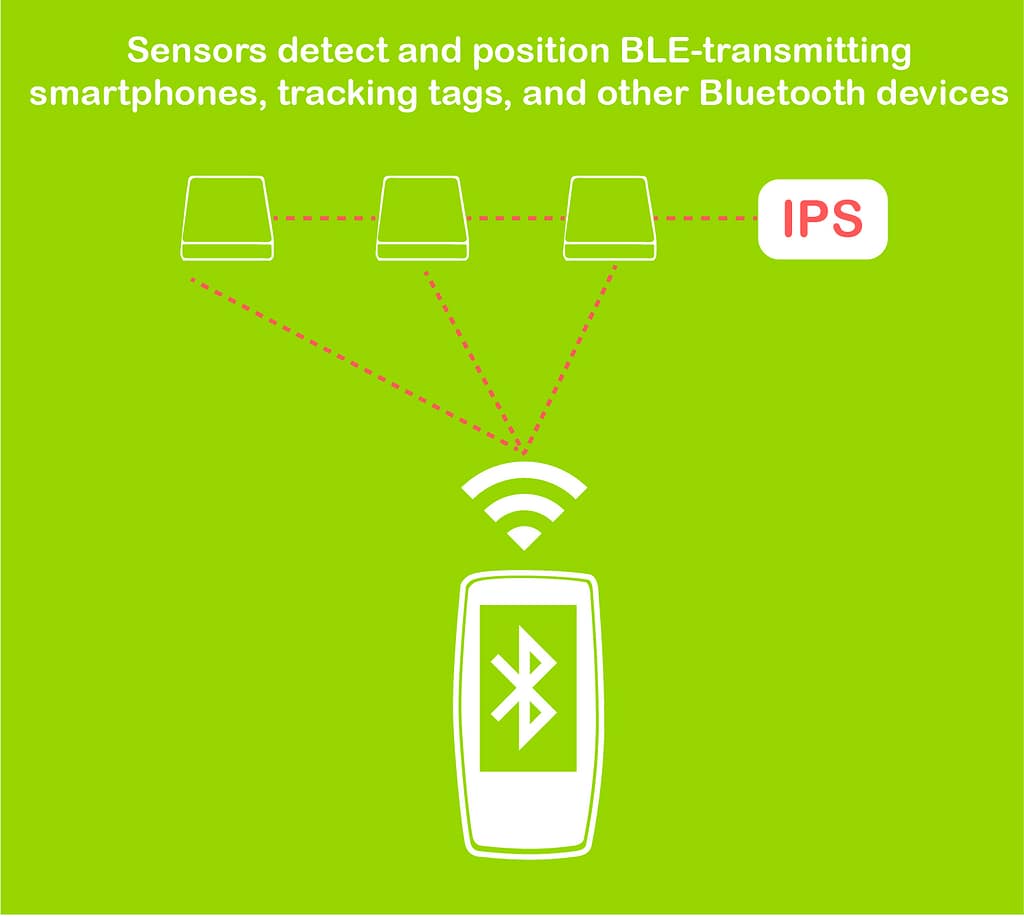 - Sensors – In this case sensors are deployed in fixed positions throughout a site. These sensors are then used to passively detect and locate transmissions from BLE devices based on their signal strength. This location data is then sent to a real-time location system that uses different algorithms to determine the location of BLE devices. That information can then be used to visualize the location of a device in a floor plan.
