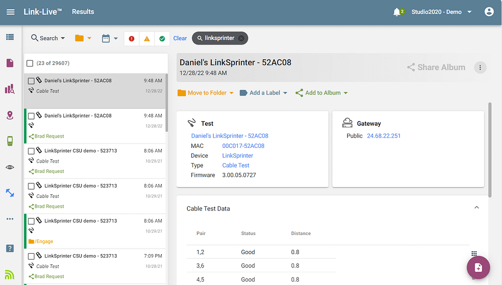 After each test, LinkSprinter automatically sends your test results to the free and included Link-Live collaboration, reporting, and analysis platform. You now have a documented record of connectivity from each wall jack, including switch slot/port/VLAN details. These test results can also be e-mailed to yourself or other team members so they can be viewed from any mobile device. You can reply to the e-mail and add comments from your mobile device with the wall jack location or other important information that helps you to identify the complete connection path. You can even attach photos to each test. This might include an image of the wall jack, of a connected device, or a serial number or asset tag.