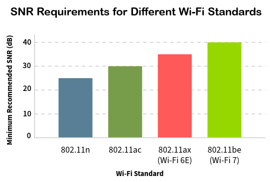 - WiFi 6/6E (802.11ax): Requires 35 dB SNR to work efficiently