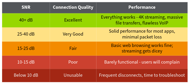 - WiFi 5 (802.11ac): Needs 30 dB SNR for best performance
