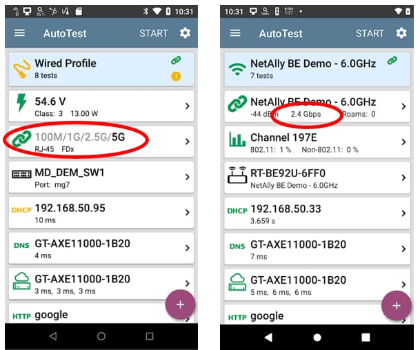 • NetAlly AllyWare™ Apps: Use the AllyWare apps, guided by the How to do a Wired AutoTest and How to do a WiFi AutoTest tutorials. These apps perform active tests to show you your link speed on both wired and wireless networks, plus provide access to information not available on mobile devices.