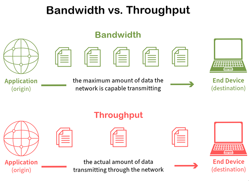 Throughput is the speed we experience when using our network and is usually lower than the bandwidth or data rate