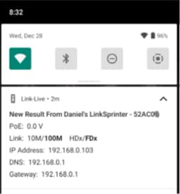 The AirCheck G3 can ‘Pair’ with a LinkSprinter or Test Accessory that is part of the same “Organization” via Link-Live. Anytime a wired test is run from the paired tester (on a link with connectivity to Link-Live), the results will be automatically pushed from Link-Live back to the AirCheck G3 where they will be displayed – think of it as a display on the LinkSprinter or Test Accessory when the LEDs do not provide enough information.