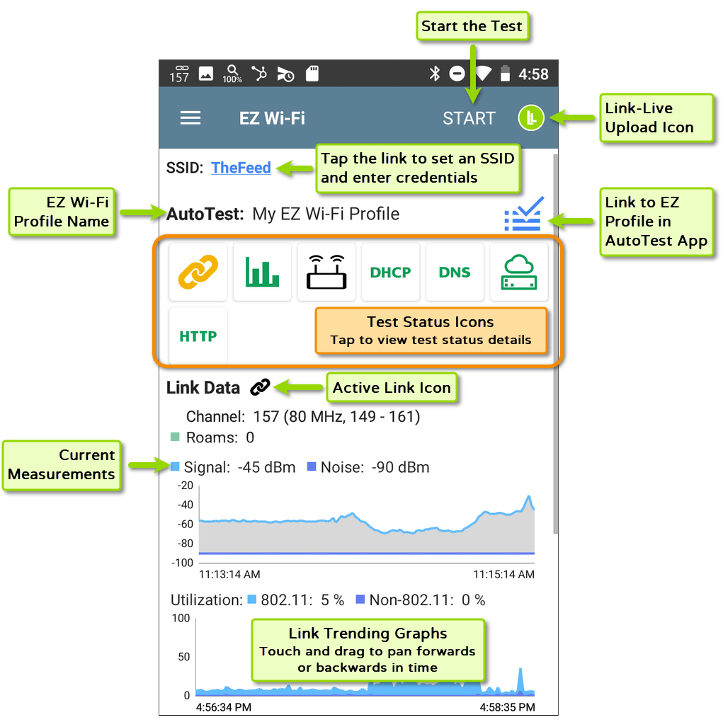 EZ Wi-Fi consolidates key Wi-Fi metrics such as signal strength, channel, retries, and TX rates. Link Data graphs continue to update in real time while the connection remains active.