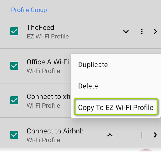 On the AutoTest Settings screen, tap the overflow icon for the profile you want copied, and select Copy to EZ Wi-Fi Profile.