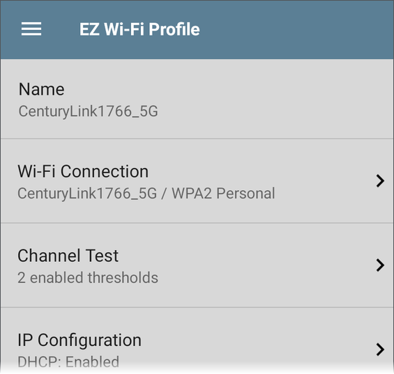 EZ Wi-Fi uses the configuration from the current EZ Wi-Fi Profile, including Wi-Fi Connection settings and test targets. Like other Wi-Fi profiles, the EZ Wi-Fi Profile is named after the SSID once one is selected.