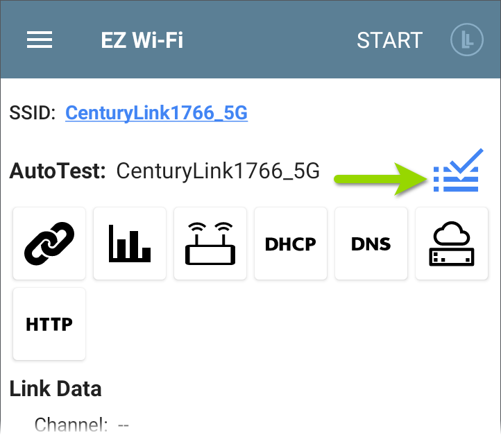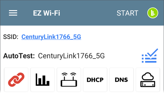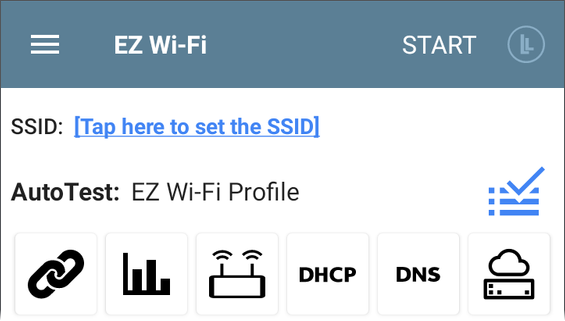 The EZ Wi-Fi application provides a simplified workflow for testing a wireless network connection. When you tap START, the tester connects to the selected SSID and performs standard AutoTest Wi-Fi Profile test steps in the background, while EZ Wi-Fi presents the results in a condensed format.