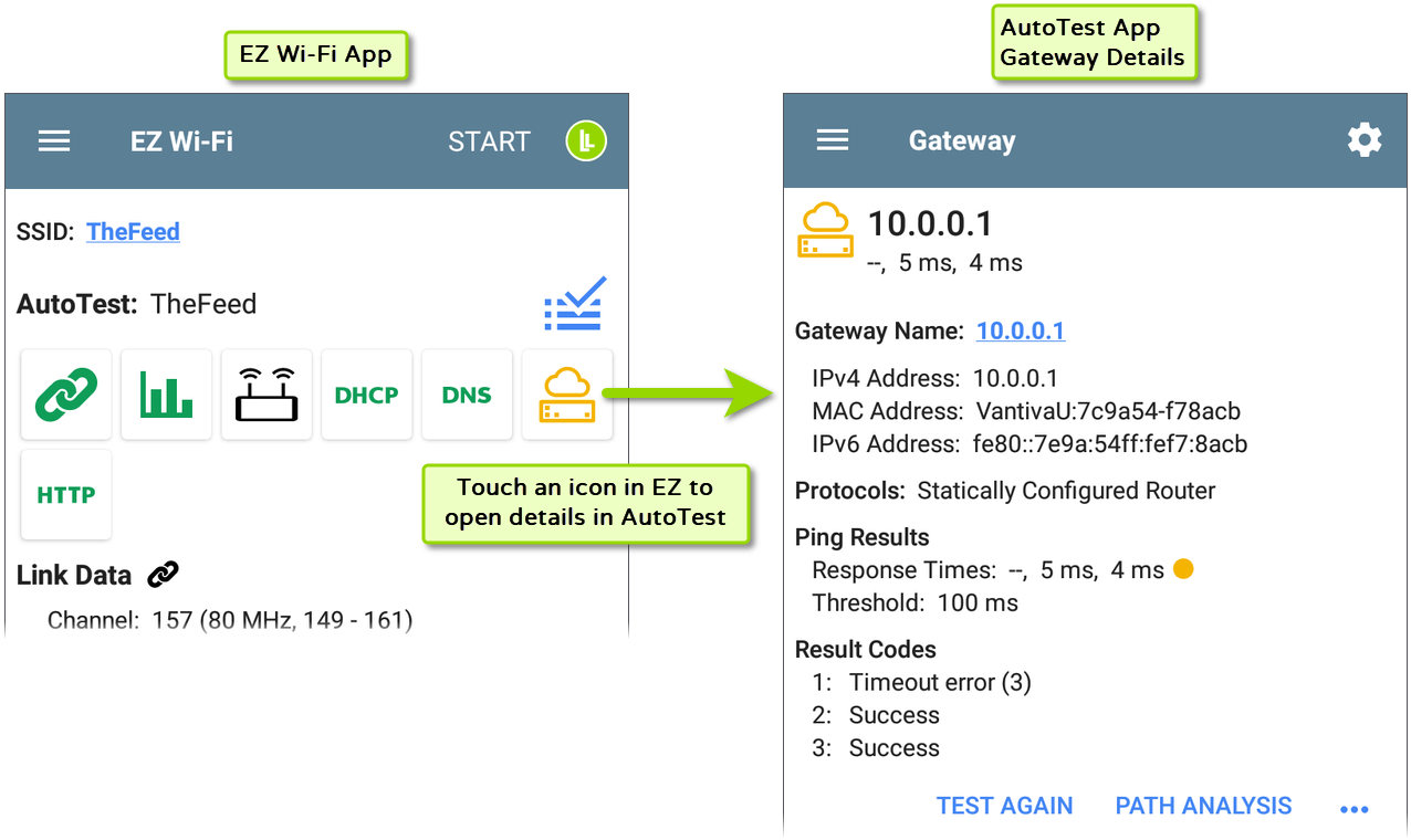 On the EZ Wi-Fi screen, tap the icon to open the EZ Wi-Fi Profile results screen in the AutoTest app.