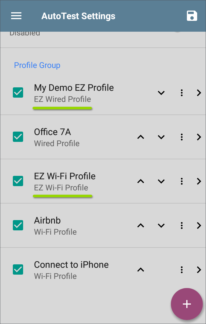 Touch any of the profile names to open and customize their individual settings. See Managing AutoTest Profiles and Profile Groups for the full topic on this screen and its functionality.