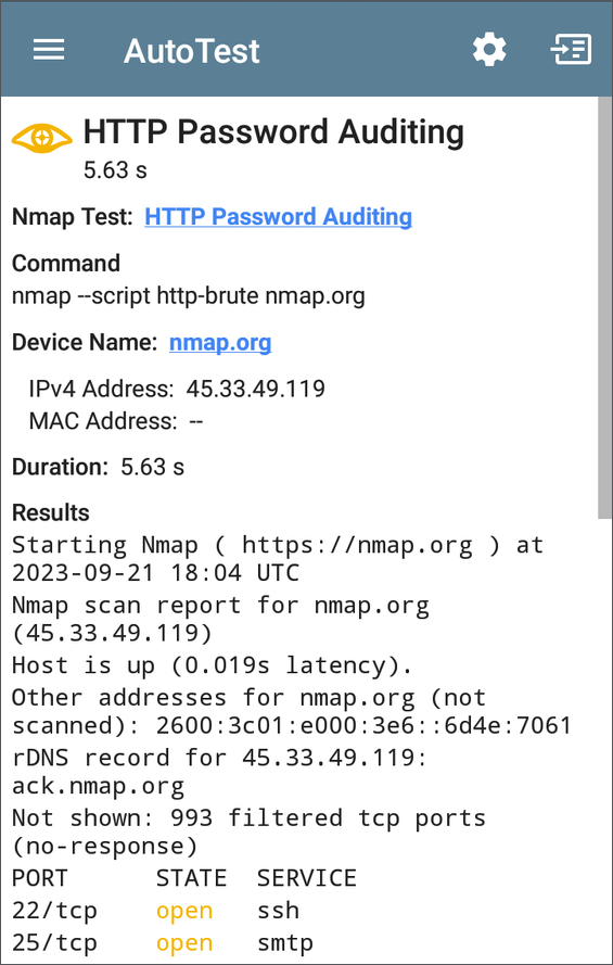 Nmap test results vary widely depending on the nature of the test. The sample HTTP Password Auditing test, provided by NetAlly, checks for open ports at scanme.nmap.org, a demonstration website for simple port scans provided by Nmap.org. The scanning locates several open ports that might be cause for concern and generates a warning. The open ports are colored yellow, as is the overall test icon. This provides a quick visual summary of the test results. See Nmap Output for more information on Nmap results screens.