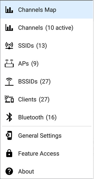 The number in parentheses shows how many active network characteristics are detected for each category. The example screen above shows (5) active Channels, (9) SSIDs, and so on.