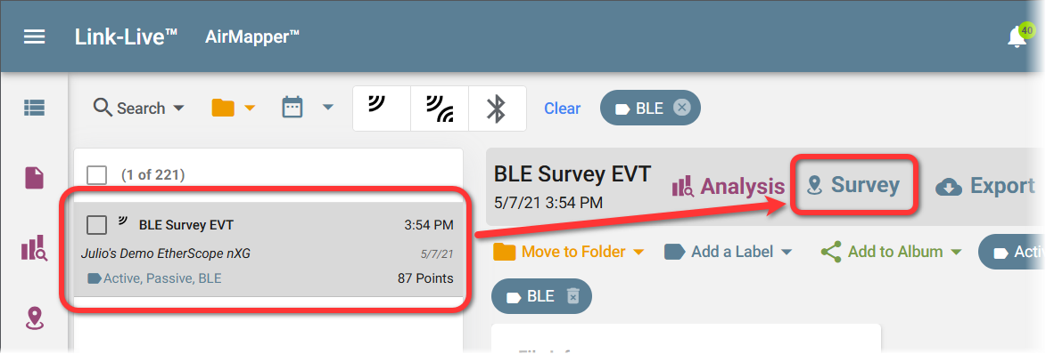 To open the unified Survey view, select a file on the AirMapper screen and click (or tap) the Survey button.