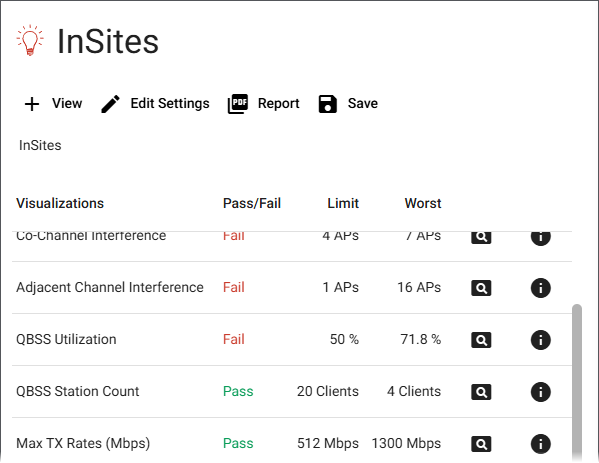 QBSS Utilization and QBSS Station Count are now included as configurable thresholds and pass/fail gradings in InSites.