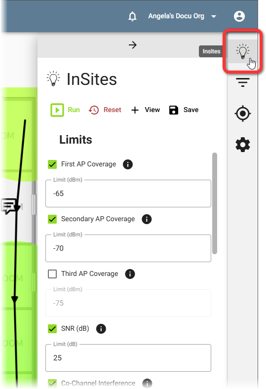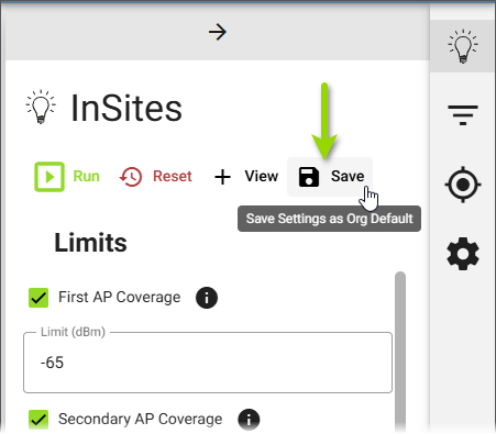 InSites configurations can be Saved to set them as the default InSites configuration for the entire organization. Click the Save button near the top of the InSites slide-out box.