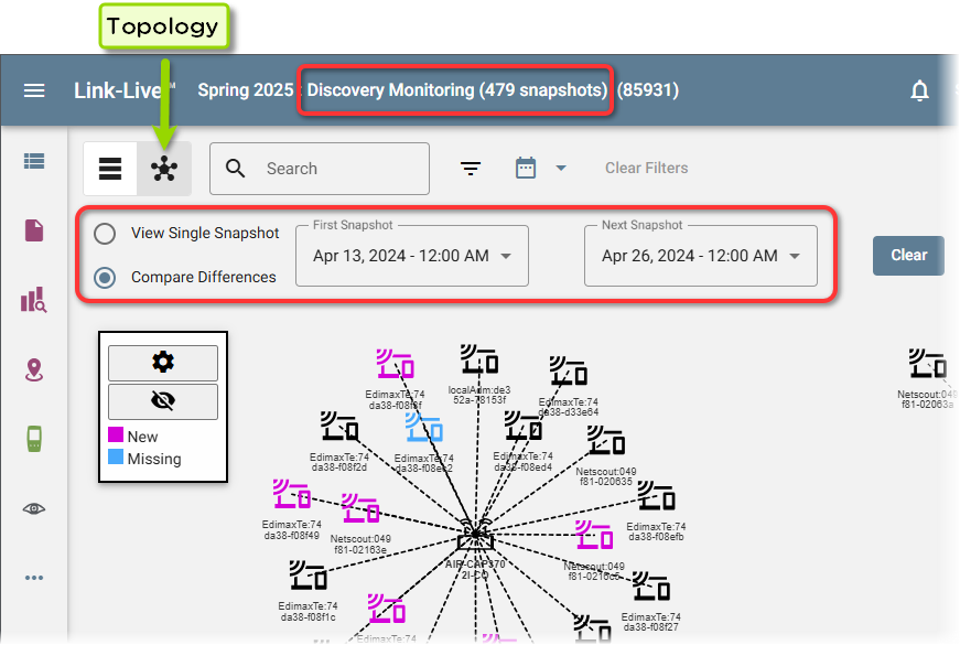 New and missing nodes are shown in color in both the Topology view and the Details view.