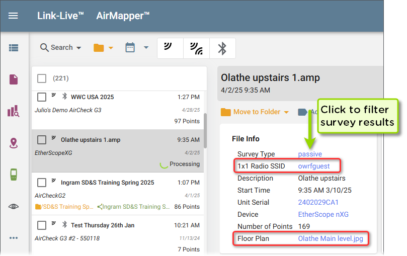 Users can now filter Survey files on the main AirMapper screen by SSID and by Floor Plan file name. Click the blue links under File Info to filter for that element.