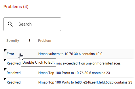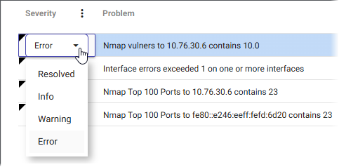 The Problem Severity status in a discovered device’s details provides a drop-down menu for selecting a new Severity. Options are Error, Resolved, Info, and Warning.