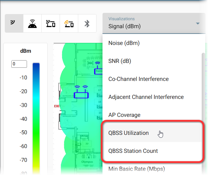 QBSS Utilization and QBSS Station Count measurements are now reported when they are available in the Passive survey data. These are Visualization options for the Survey Map columns in the survey data table.