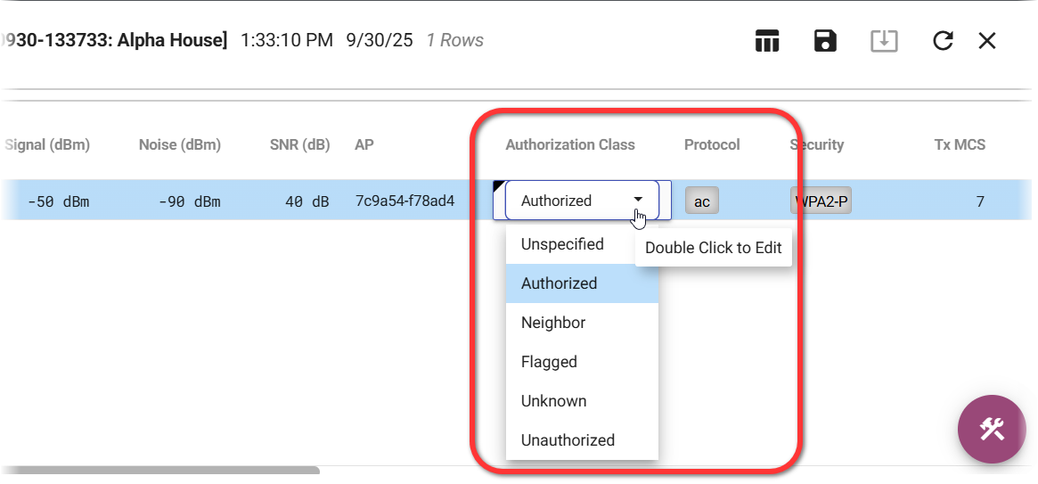 A device’s Authorization Class can now be edited in the Survey data table. Changes to the Authorization for that device will appear everywhere it appears in the currently viewed Survey.
