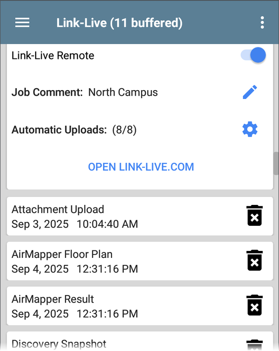 A red delete icon in the buffered file list indicates that a particular result file cannot be uploaded to Link-Live.