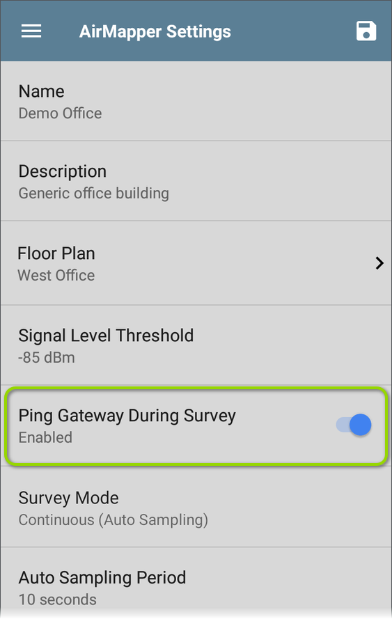 A new setting in AirMapper Surveys directs the tester to ping the Gateway during data collection, improving the accuracy of PHY TX Rate measurements. When enabled, the Ping app automatically starts and stops in sync with survey start and pause actions. This feature is enabled by default.