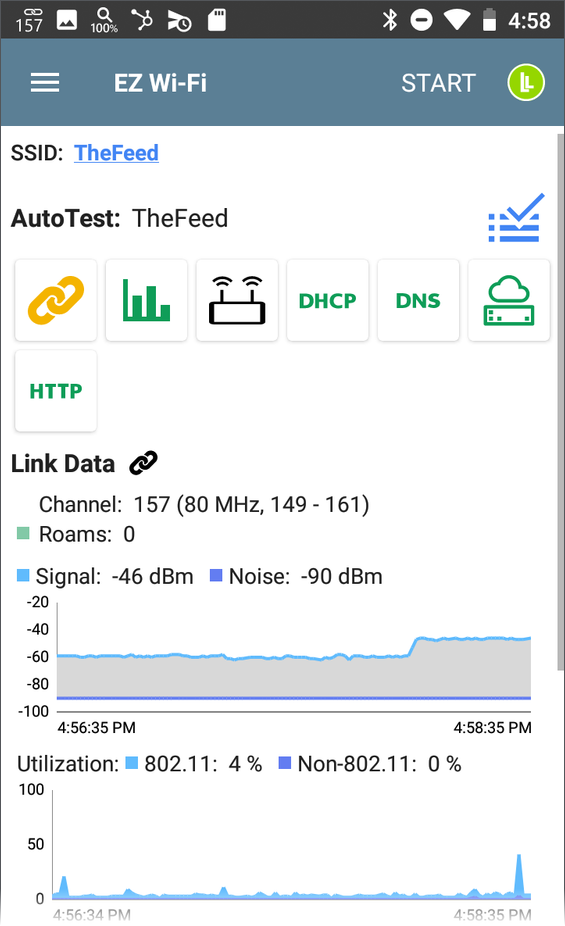 Tapping START in the EZ Wi-Fi app initiates a full wireless connection test to the selected SSID. Behind the scenes, AutoTest performs the test steps, while the EZ Wi-Fi interface presents the resulting data in a simplified format.