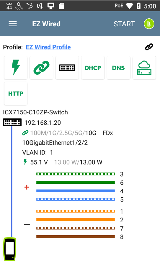 Tapping START in the EZ Wired app initiates a wired connection test. Behind the scenes, AutoTest performs the test steps, while the EZ Wired interface presents the resulting data in a simplified format.