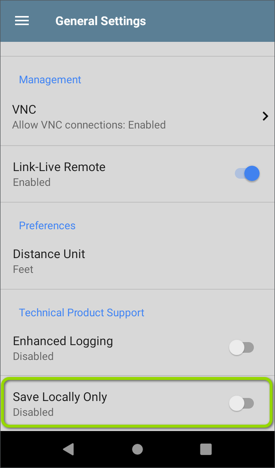 The Save Locally Only setting is intended for gathering advanced logging details in order for NetAlly's customer support team to assist with technical support. You will NOT be able to upload saved test results to Link-Live later if this setting is enabled. Therefore, the Save Locally Only setting has been relocated to General Settings, below Technical Product Support.