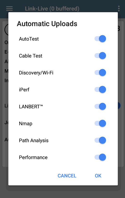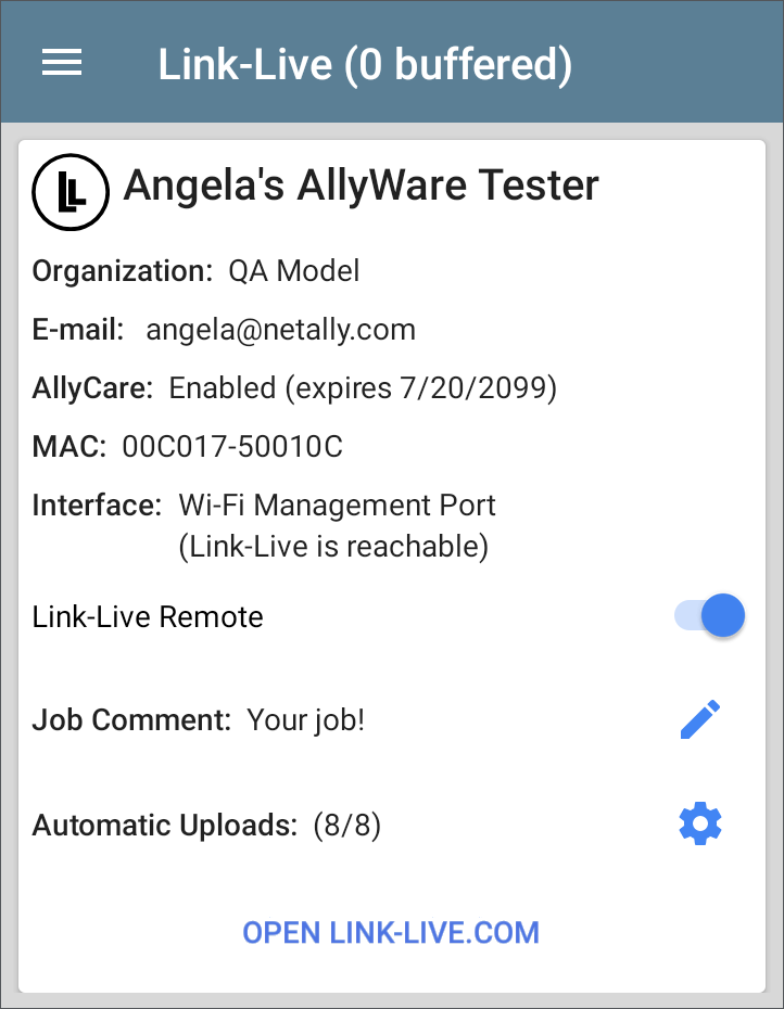 Controls for enabling Link-Live Remote, editing the Job Comment, and uploading test results automatically from test apps, are now all conveniently displayed on the main Link-Live app screen.