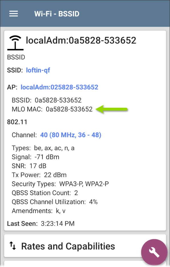 A new Multi-Link Operation section has been added to the Rates and Capabilities area on the BSSID detail screen for Wi-Fi 7 access points. When an AP includes MLO information in its beacon frames, the Wi-Fi app now decodes and displays these parameters, giving users clearer insight into the multi-link configuration and capabilities of 802.11be deployments. Additionally, the MLO MAC address is displayed on the BSSID details screen.